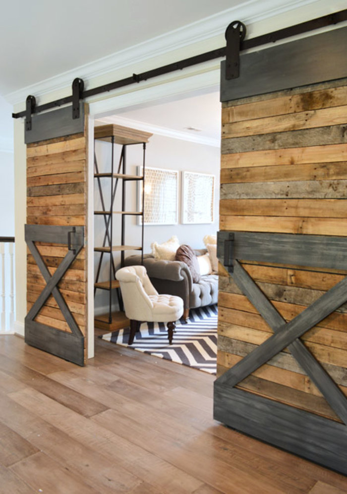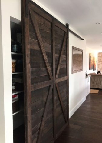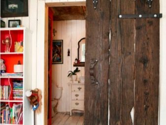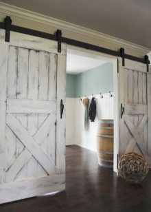 L'option la plus courante pour la fabrication de structures de grange consiste à coller les planches verticales (longitudinales) grossières (haut et bas) avec deux planches transversales. Ces modèles sont dans la plupart des cas sujets au vieillissement artificiel de la surface, ce qui confère un charme particulier à l’intérieur. Pour ces portes, utilisez le plus souvent de grandes poignées en métal, qui peuvent être placées à la fois horizontalement et verticalement.