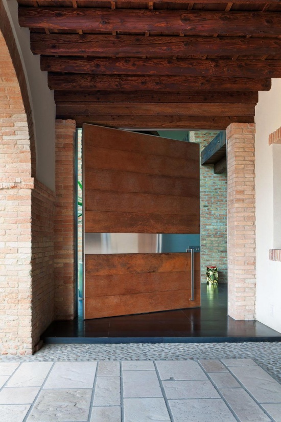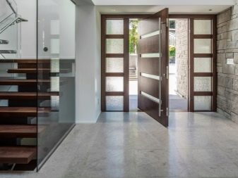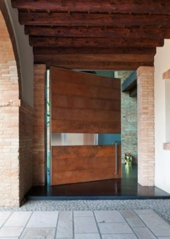 En plus de son attrait esthétique, la porte d'entrée doit avoir de bonnes propriétés de protection. Pour cette raison, les constructions métalliques d'entrée sont très populaires. L'installation de portes en bois massives est autorisée. La texture endommagée et les irrégularités du bois confèrent au produit un attrait particulier, une originalité.