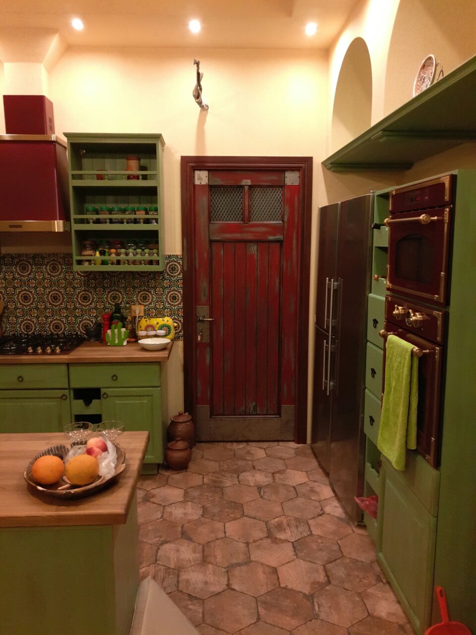 Le lin bourguignon en bois crée un contraste saisissant avec les meubles de cuisine aux tons de vert.