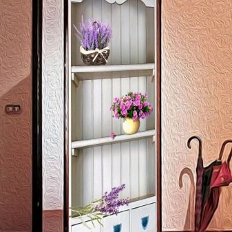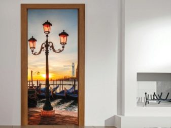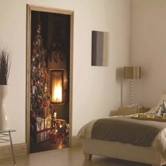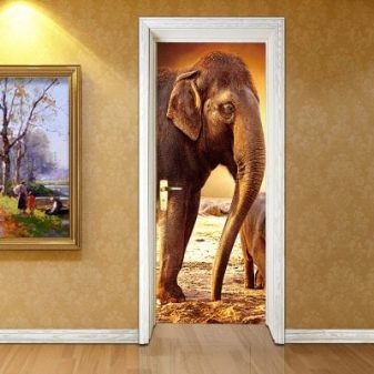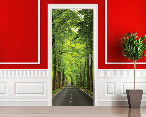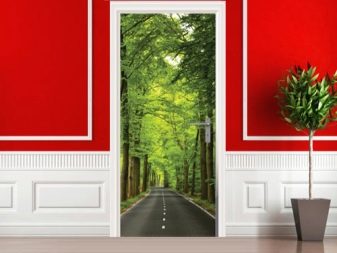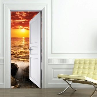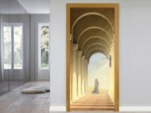 Autocollants, affiches ou papiers peints sur la porte couvrir toute la surface et peut changer radicalement l’intérieur. Cela dépend en grande partie du motif sélectionné. À ce jour, la gamme de papiers peints photo pour les portes est immense - du paysage au portrait de l'artiste. Ils se débrouillent bien avec la tâche de mettre à jour l'apparence du vantail de la porte, ce qui économise grandement le budget.