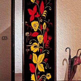 Les autocollants décoratifs sur les surfaces des portes ne se limitent pas à des règles et des cadres, leur gamme est donc très riche. Vous pouvez également créer cet article de décoration en fonction de modèles et de tailles individuels.