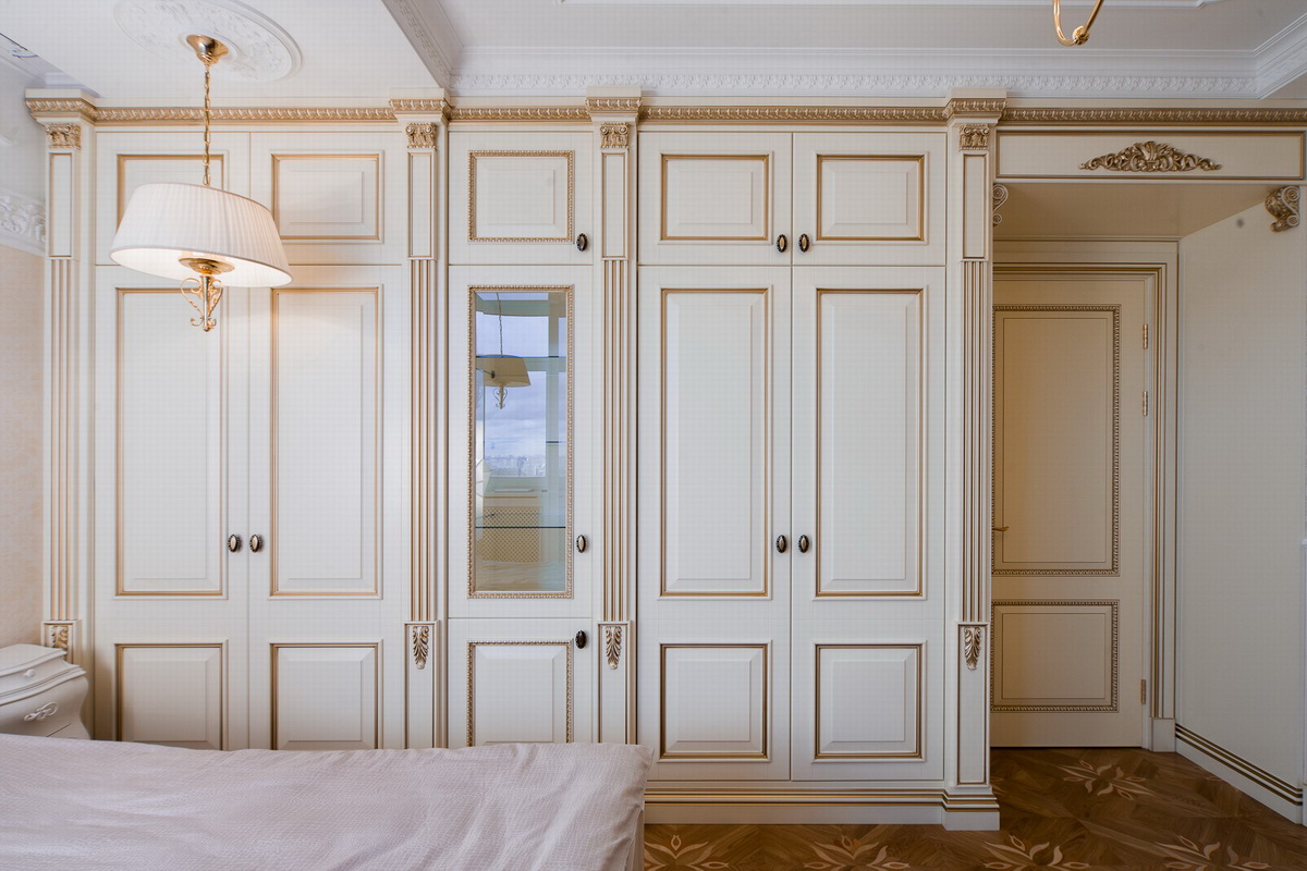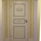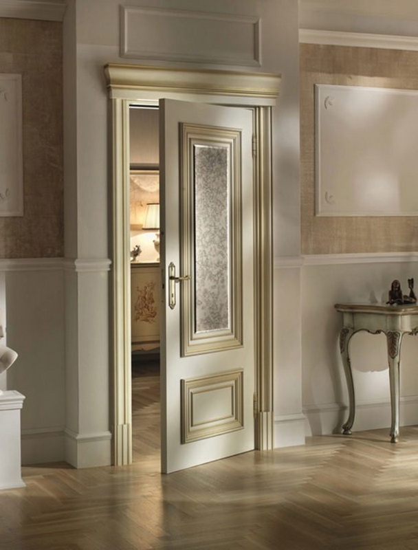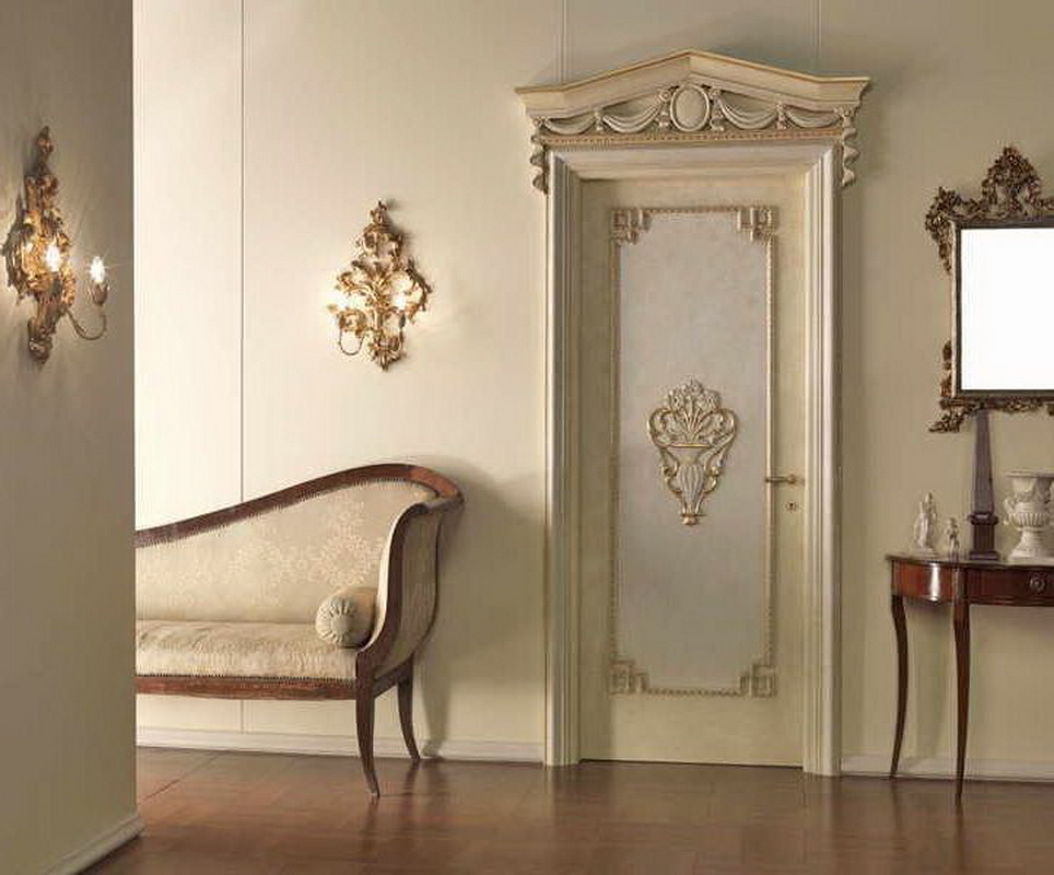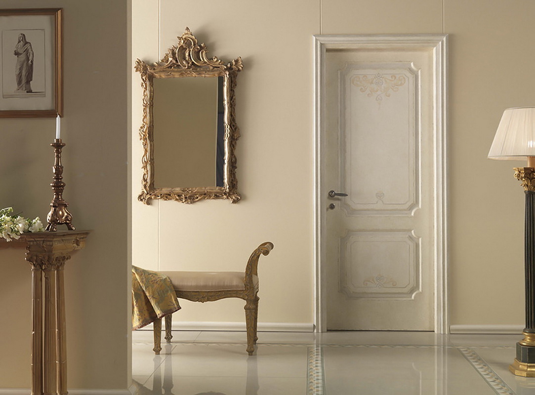 Le traitement de surface doré de la porte complétera harmonieusement les éléments du décor avec de l’or: appliques, lustres, encadrements de miroirs et peintures.