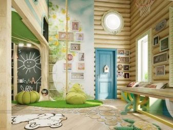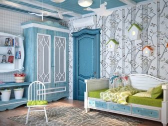 Dans la pépinière, les modèles acceptables sont fabriqués uniquement à partir de matériaux naturels. Le design des couleurs doit être amusant et lumineux. Ce sont des nuances audacieuses de violet, bleu, olive. Pour des raisons de sécurité, évitez les angles et les projections dans le décor. Lorsque vous choisissez un modèle de produit approprié, vous devez tenir compte de la situation générale dans la pièce.