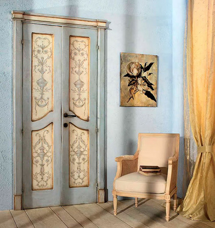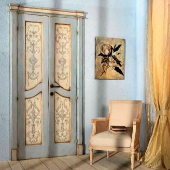 Pour créer toute l'image provençale dans la décoration intérieure, même les portes doivent être élégantes. Les principales caractéristiques de la feuille de porte dans ce style: