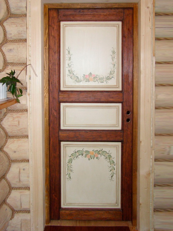 Pour donner un certain thème à l'intérieur général, il est possible de faire revivre des toiles de portes monophoniques à l'aide de la peinture. Cela change instantanément le look du produit. Les bouquets d'herbes épicées et parfumées et de violettes des prés, de paysages marins et de branches d'olivier lors de l'exécution du tableau donneront à la porte une nouveauté attrayante.