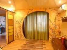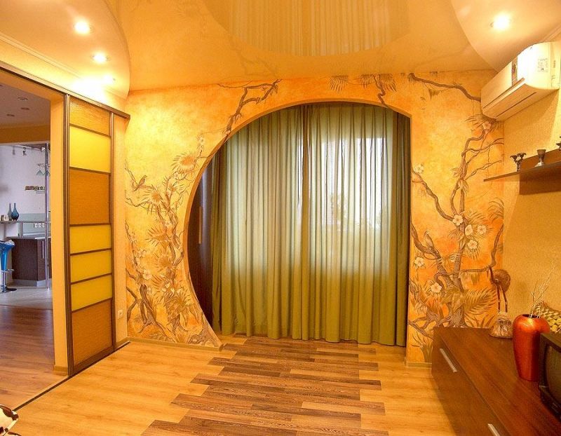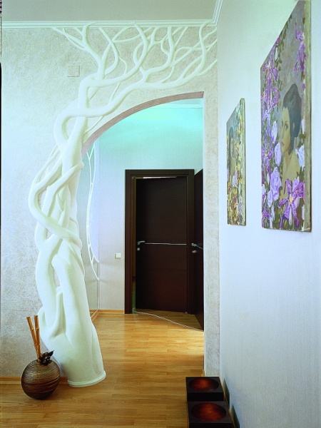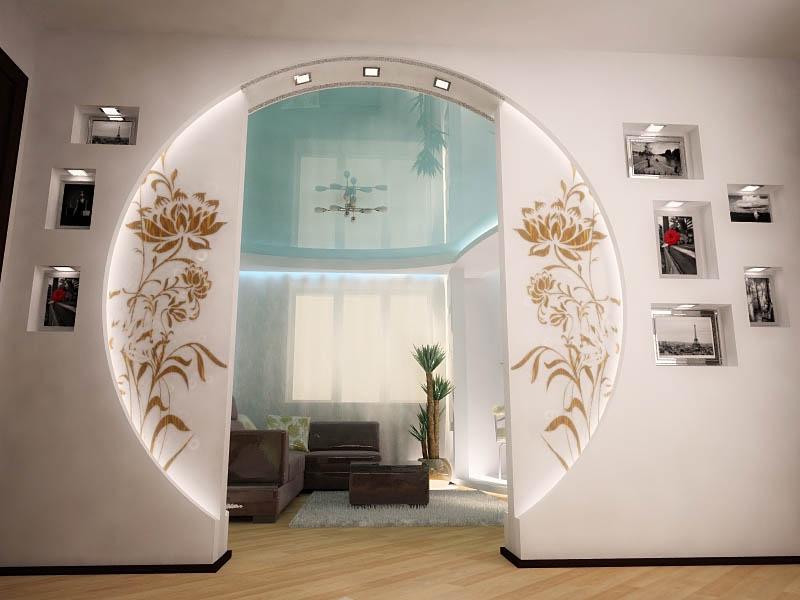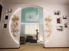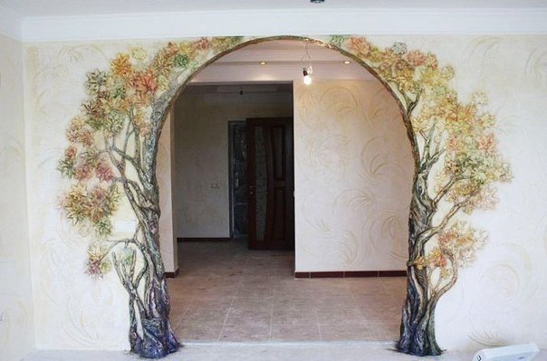 The arch in the living room can be trimmed with a pattern. It can be either geometric or abstract images, or whole works of art in the form of paintings. The edging of the arched door may have three-dimensional shapes.