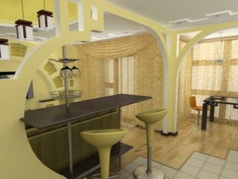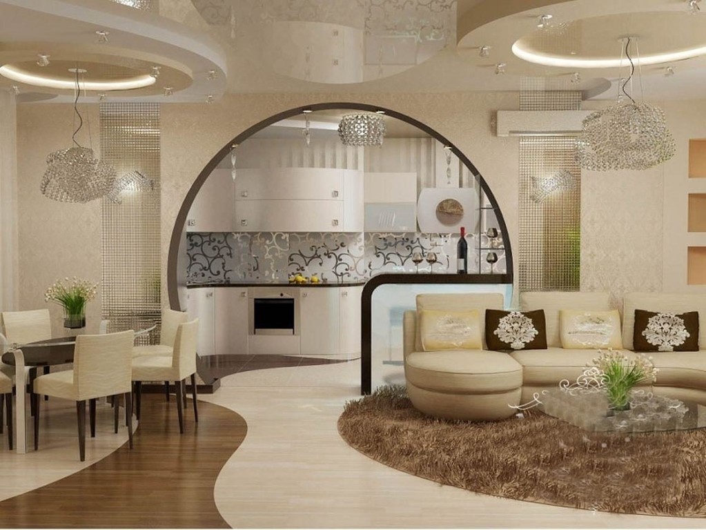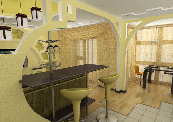 The interior of the apartment is very fashionable is a combination of the arch and the bar. This is a stylish solution that involves the separation of the living room and kitchen. The stand will be both unifying and demarcating for these two zones.