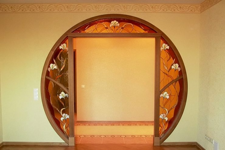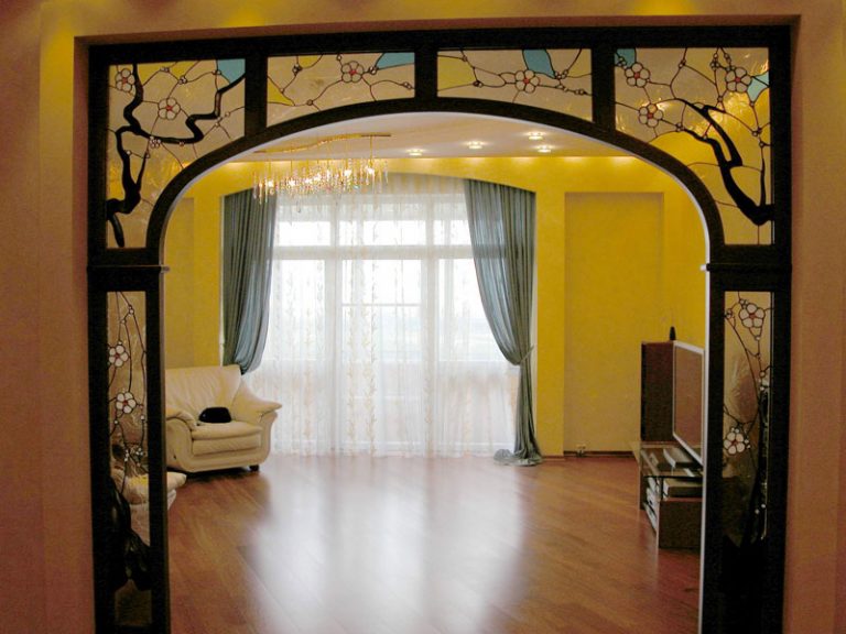 Arched structures are often decorated with stained glass or mosaic. They are made to make and with the help of stained glass. This design will look very bright and aesthetic. Moreover, a mosaic or stained glass window can decorate both the entire arch and its individual elements.