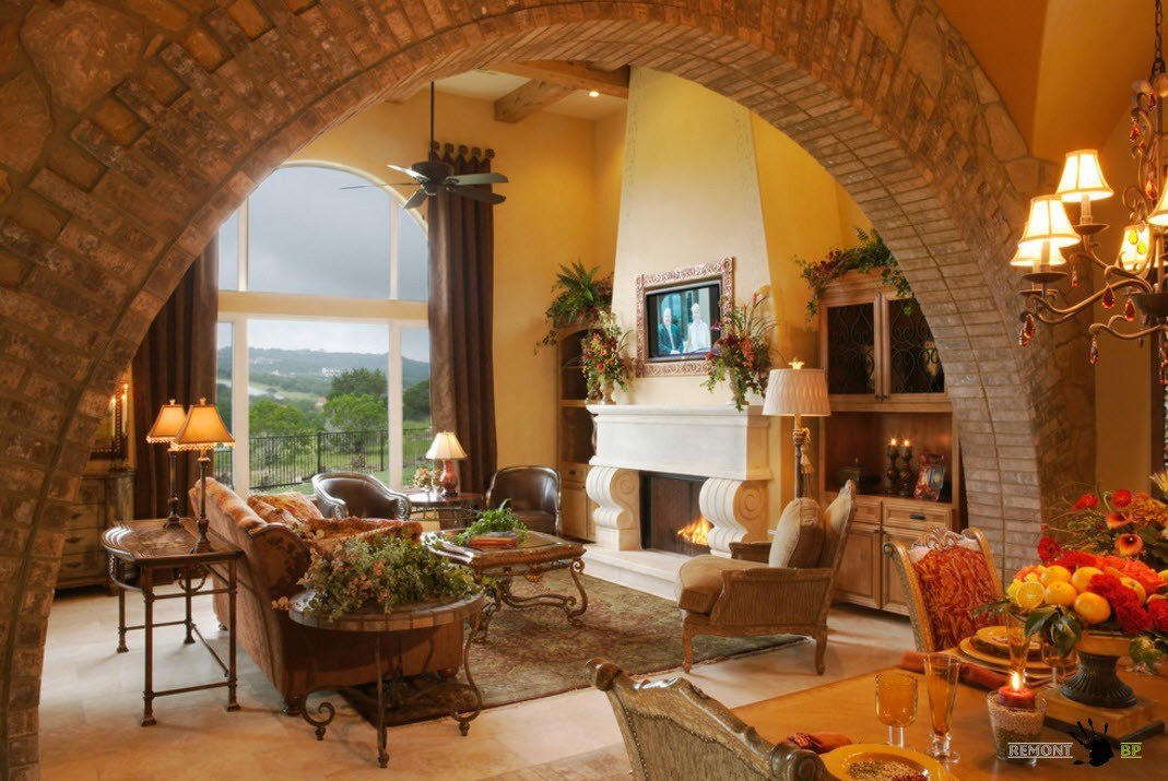 The arch in the interior of the house can be elegantly decorated in the spirit of romanticism. In this case, its shape should be slightly rectangular, but all corners should be smoothed out. For such a stylistic direction more suitable wide openings.