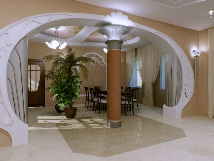 Arches in the style of romanticism or classic can be decorated with stucco. So you can even arrange a room in the Baroque style. Stucco can be made in the form of columns, beautiful figures. Such an arched structure may differ balleriephs.