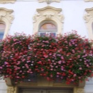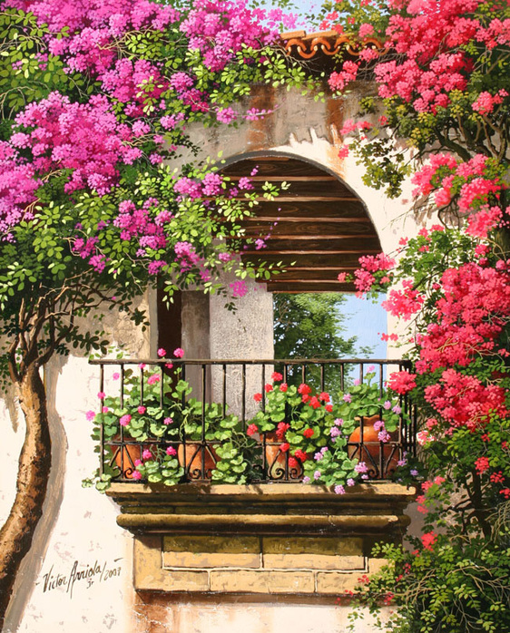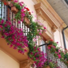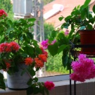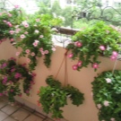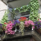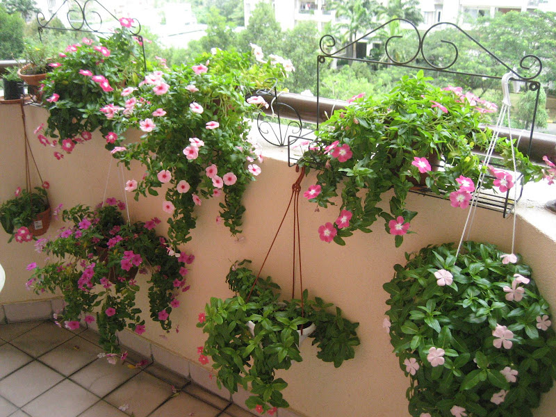 - Large bright balcony, richly decorated with ampelous plants in pink shades.