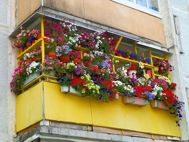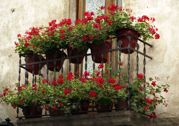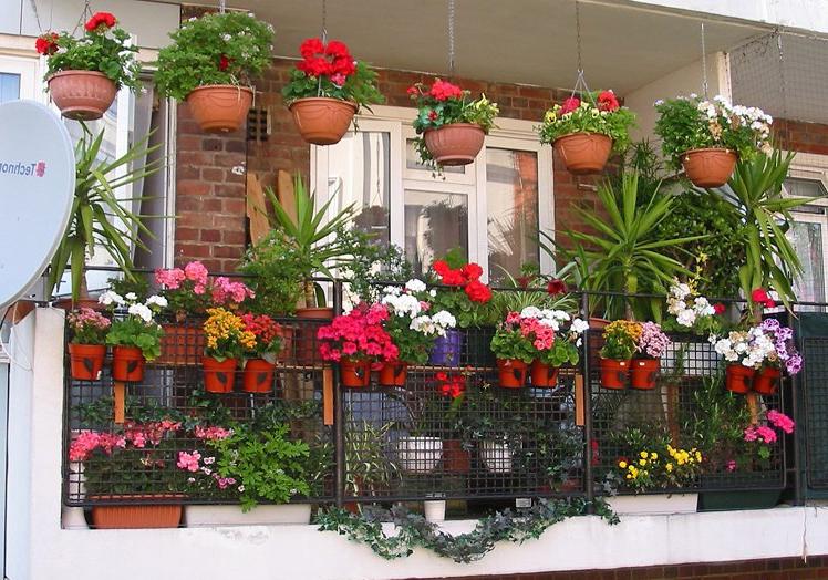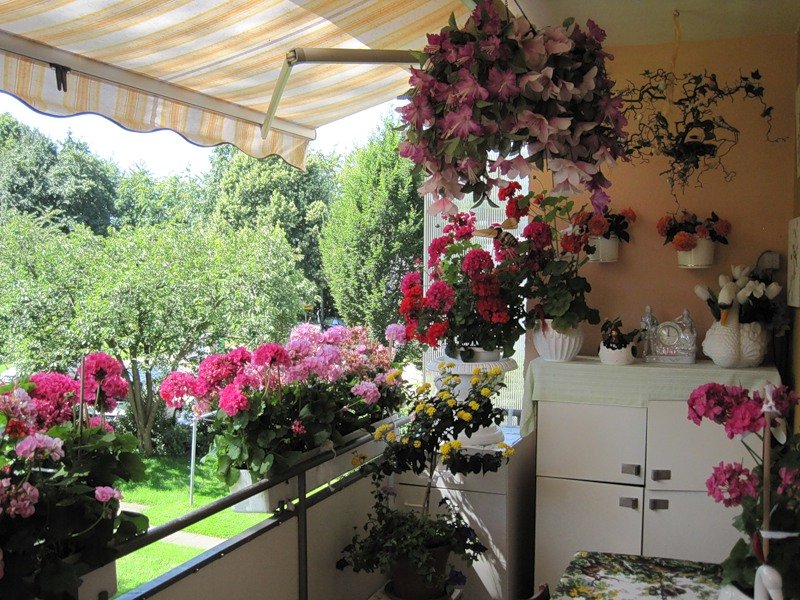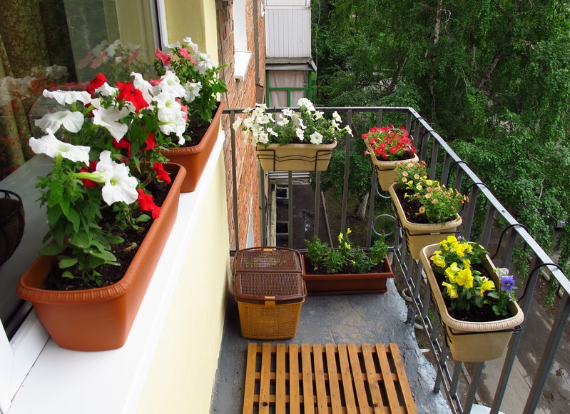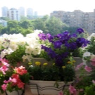 - The most decorated balcony of an ordinary apartment. In this design you can find almost all options for the placement of flowers. As for shades, there is no strong overload: red, pink, white and a little yellow.