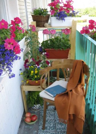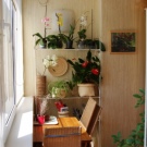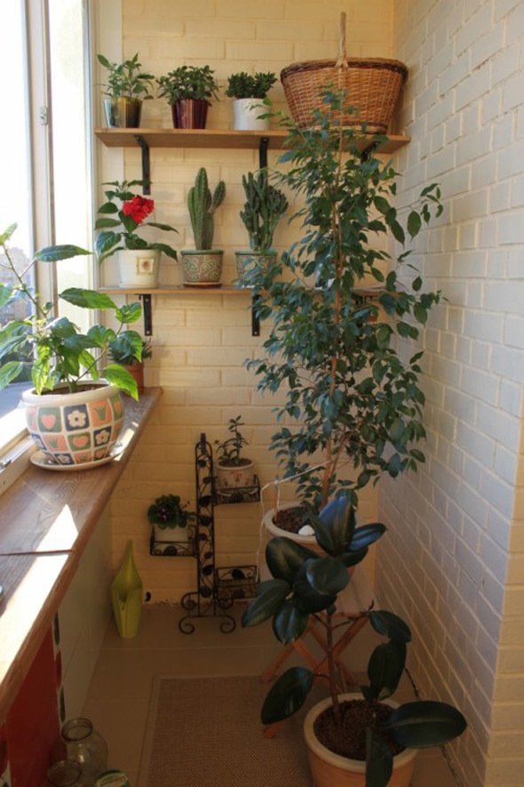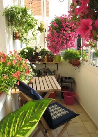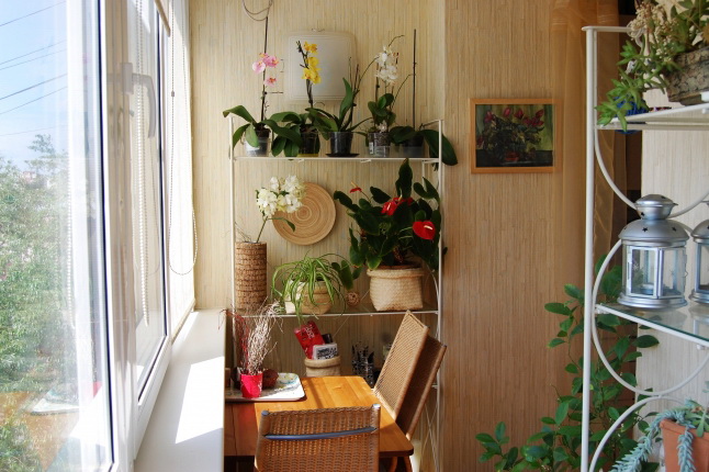 - A good example of how you can arrange beautiful flowers on a closed balcony. A small covered balcony in a standard apartment is very cozy and uncluttered.