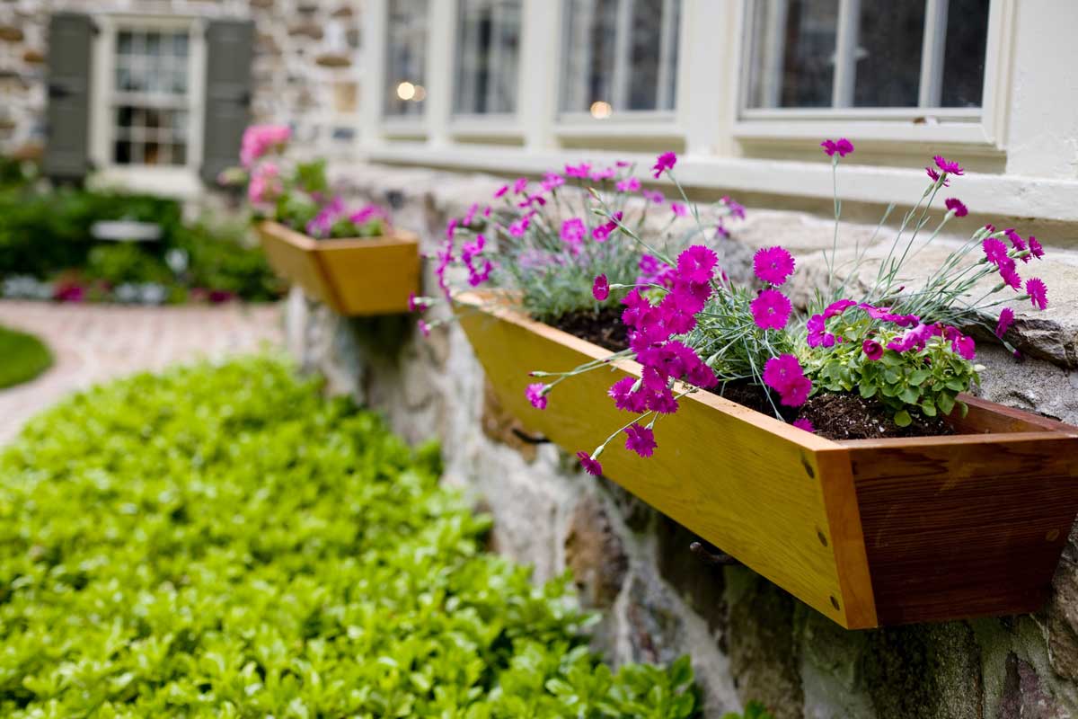 - Summer plants in small boxes can be beautifully placed against the background of linen from vines;