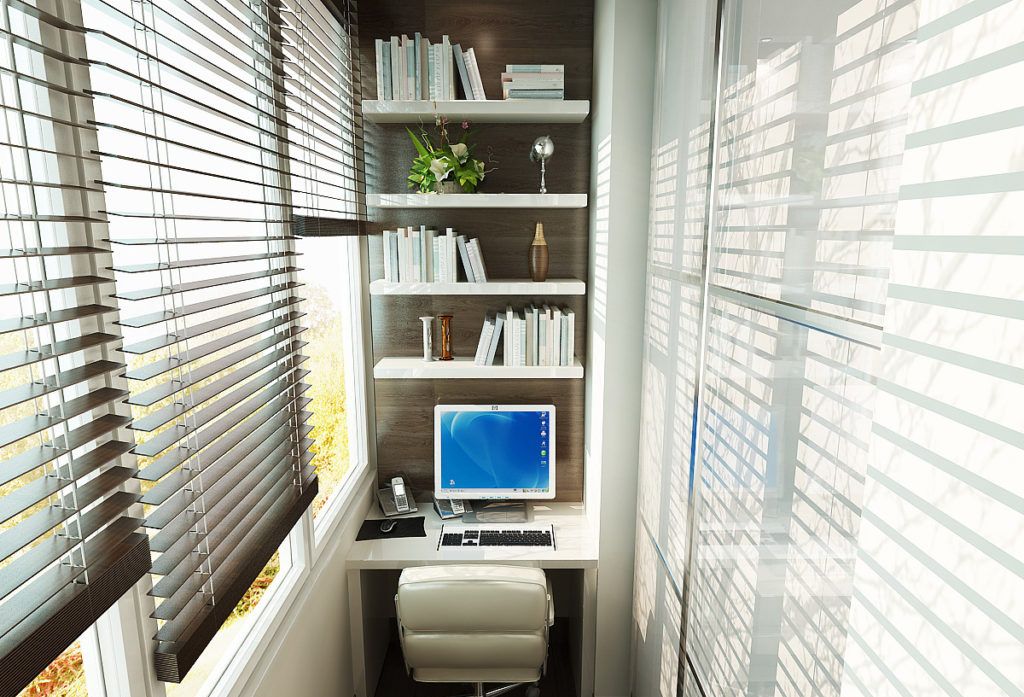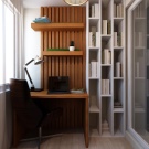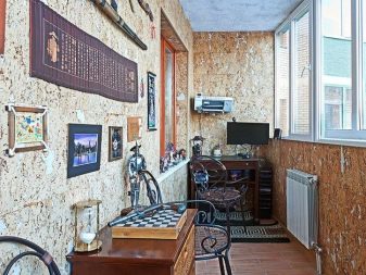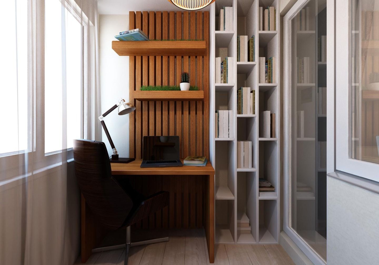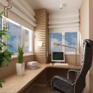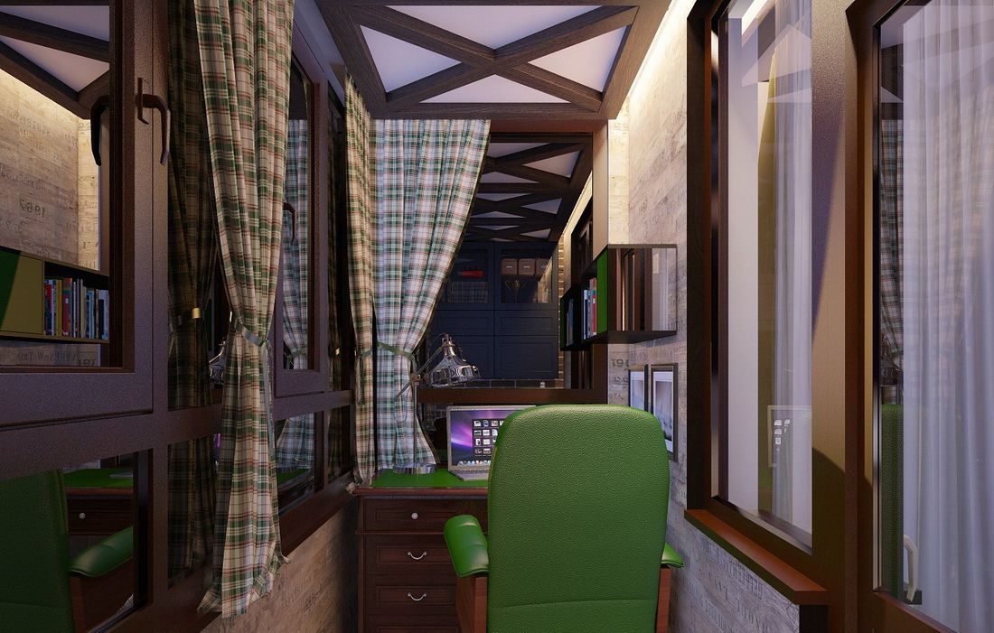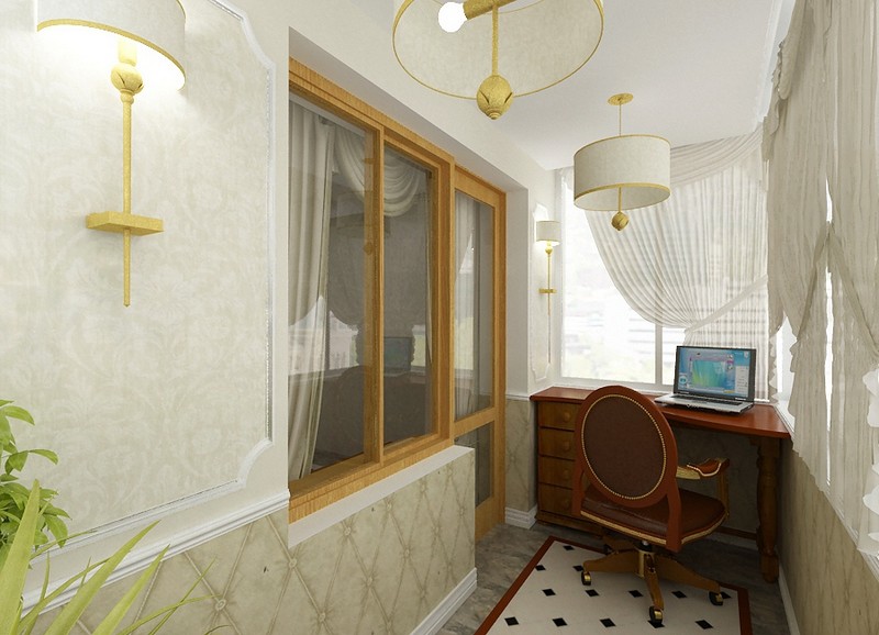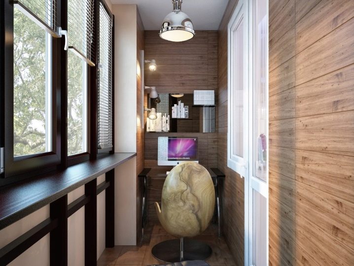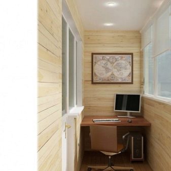 In a small Khrushchev is usually difficult to allocate a separate place to work. An excellent option would be a balcony, which allows you to effectively retire and work productively at any time. Even the narrowest balcony can be creatively equipped for a study. Finishing can be made from lining or from a tree.