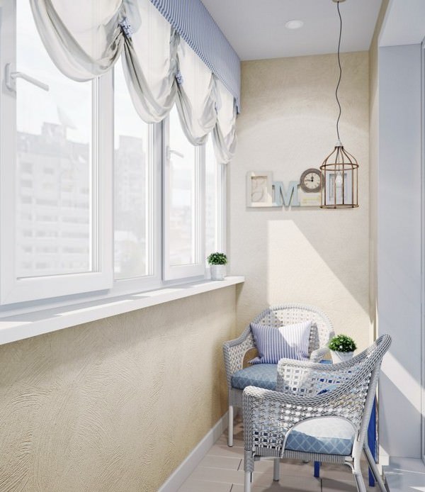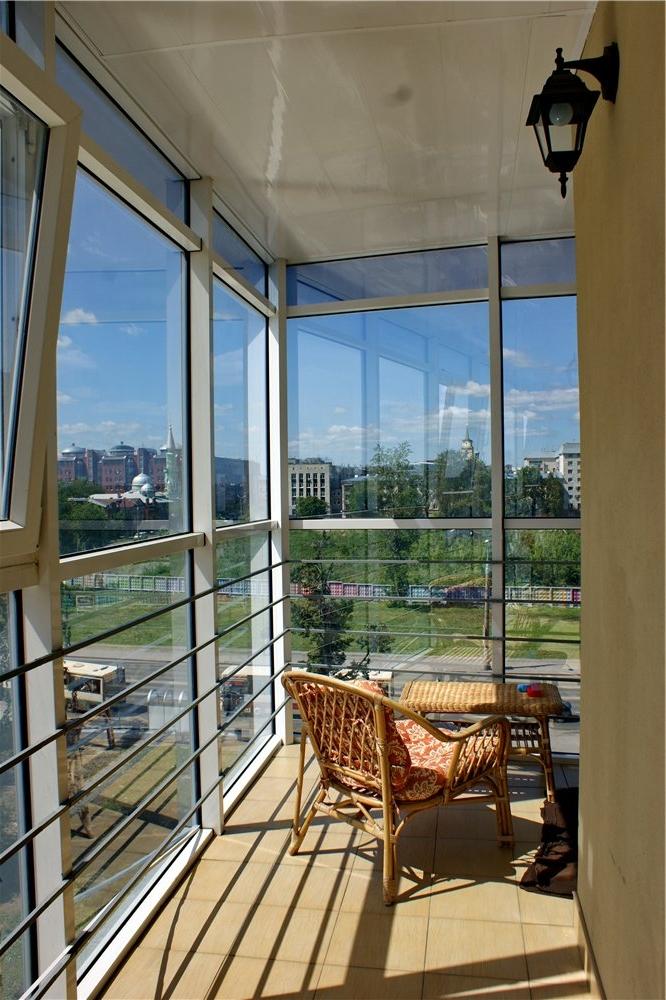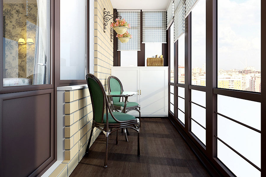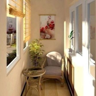 An excellent option would be a balcony with a panoramic view.Frameless design will look interesting, it will help create the illusion of open space. This option is suitable for both large and long balconies, and for a small room. You will be able to enjoy nature in the morning and in the evening, sitting in a comfortable chair, slowly sipping aromatic coffee.