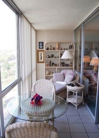 Wicker chairs and a table can be placed on the loggia. There you can comfortably gather with friends, discuss the latest news, spend time in a friendly atmosphere. Complete the balcony with an element of stained glass, place your favorite flowers on a small glass table and you will feel harmony and positive constantly when you want to go out into the fresh air.