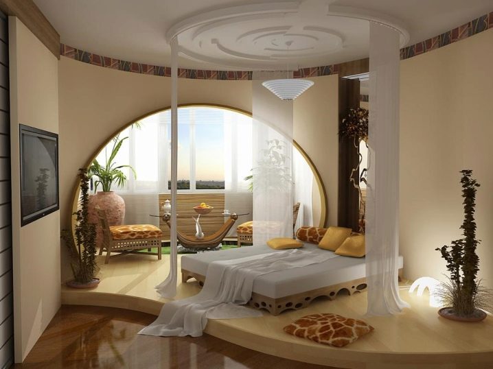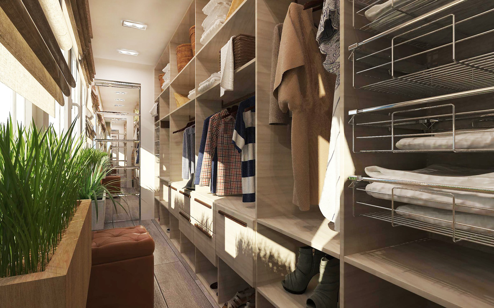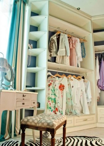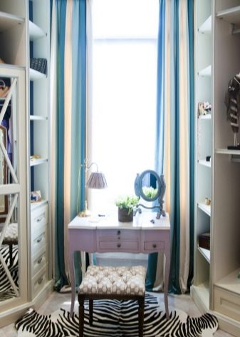 A dressing room on the balcony would be an excellent option for a studio apartment. Now you can conveniently and comfortably store your belongings in a certain place. You can decorate the space in the chosen style, where there are elements that resonate with the main room, for example, with the hall. This option is suitable for a round, semi-circular, square room.