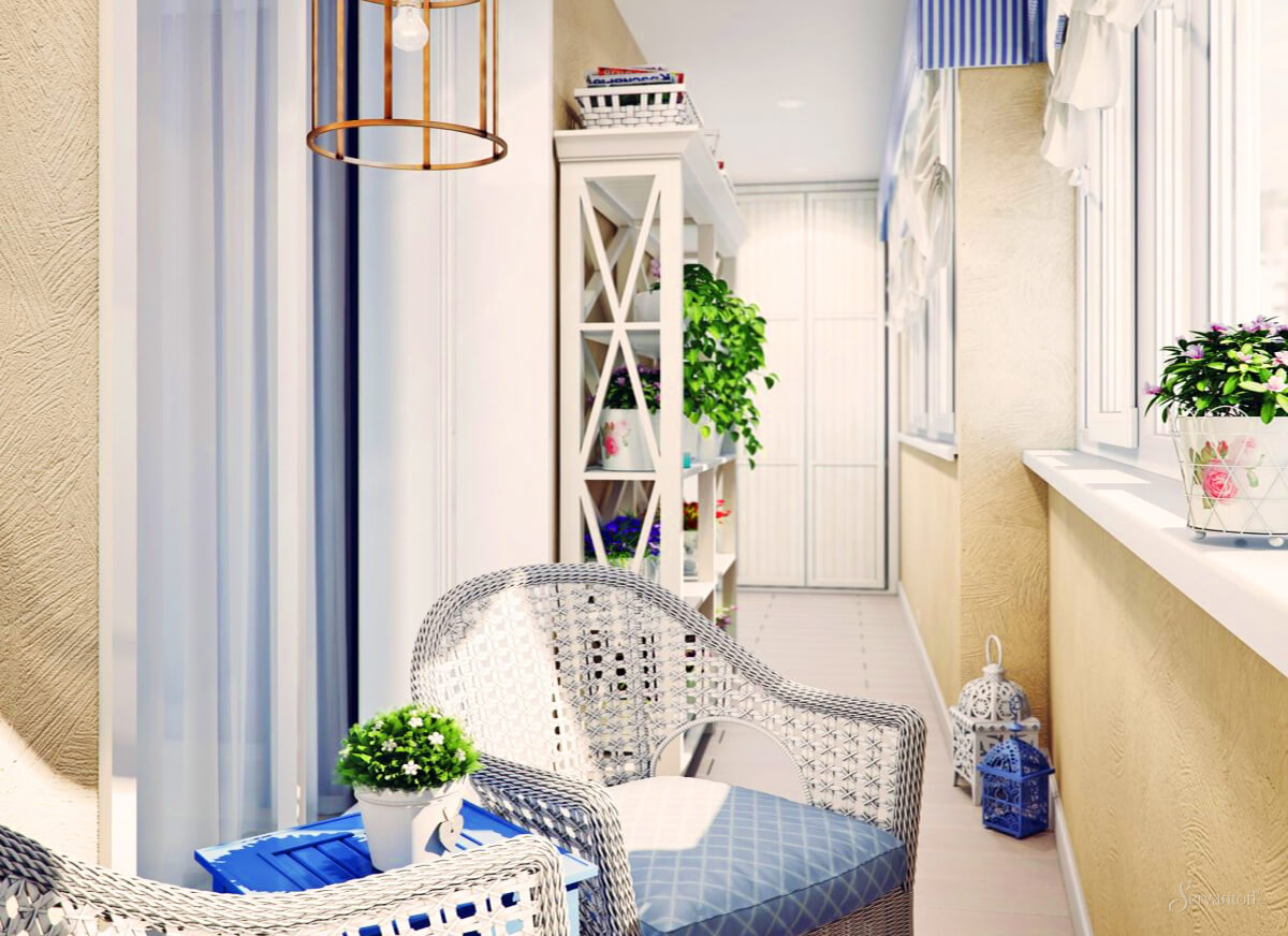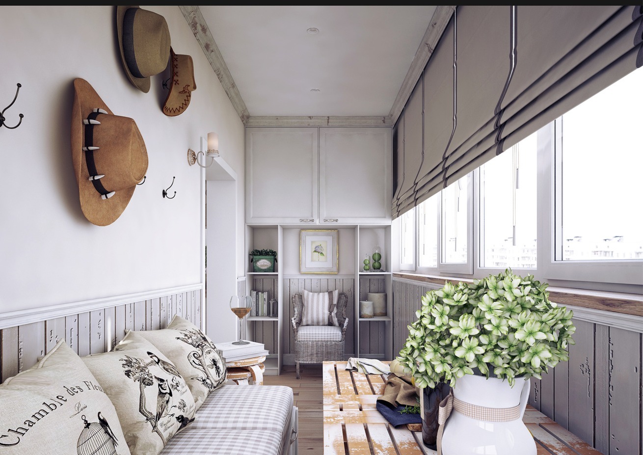 Love French motives? Then this style is exactly for you. It is suitable for any space: for the triangular, and for non-glazed rooms, etc. You can put a table, chairs / chairs or a sofa. If you have a doorway connected to a hall, for example, then it is worthwhile to continue the style concept in another room.This style involves the use of pastel shades: beige, green, lavender, marine, orange color.