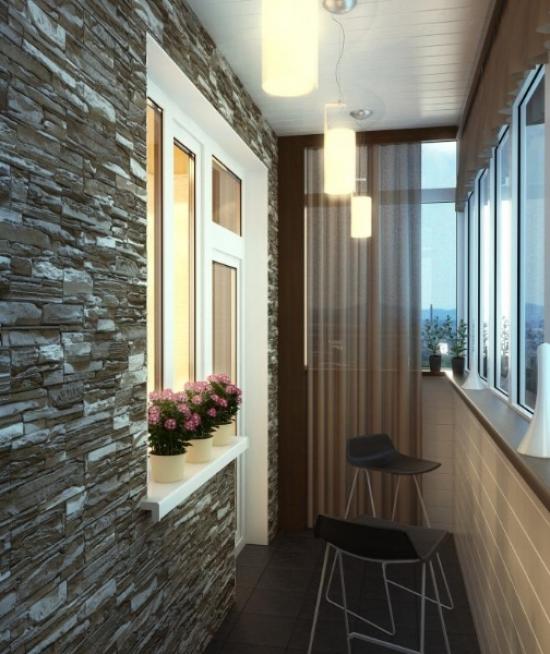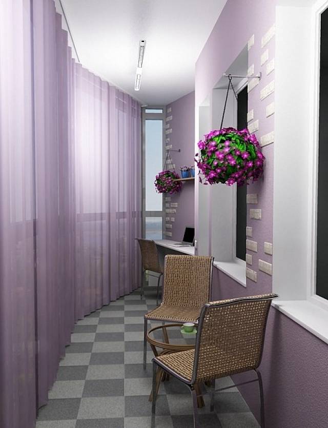 For these balconies, the use of sliding window systems is assumed. This way you can effectively save space. It is also worth rational use of angles. At the end of the balcony you can make built-in wardrobes. There you can conveniently store all household tools and accessories. Also, designers recommend using a light scale when finishing the room in order to expand the visual space.
