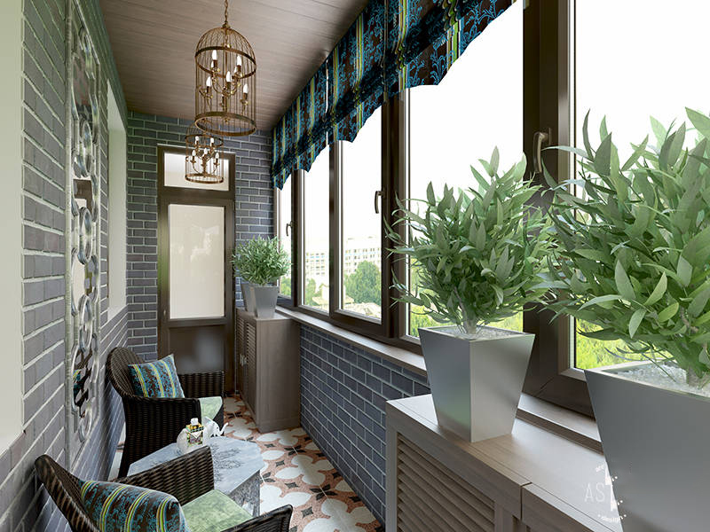 Ornaments, patterns and bright details also have a place to be. Often in such an interior can be found old brick, forging, weaving. You can pick up pillows, blankets, lampshades on lamps with an interesting decor. Good fit pots with flowers. So, you can create a great greenhouse on your loggia. Here can be located as living plants, and dried flowers.