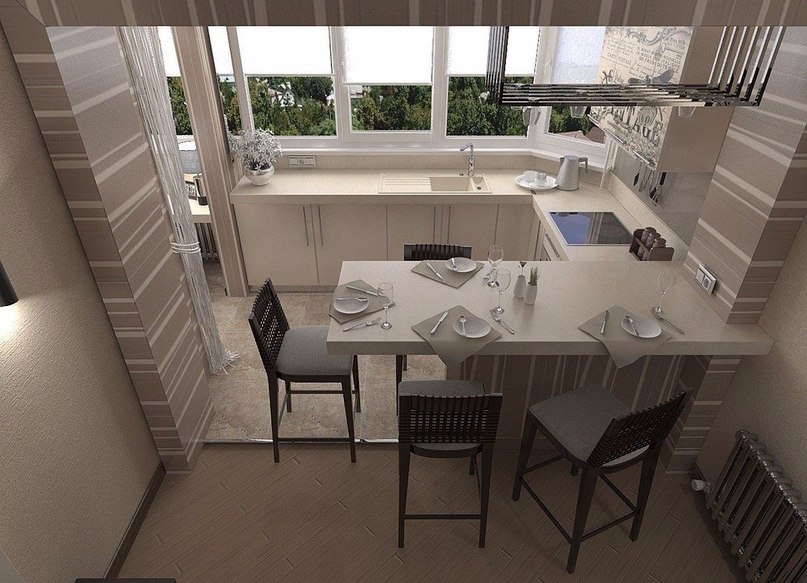 You can make such a space a great continuation of the kitchen. You can dine and enjoy the beautiful scenery outside the window.Complete the space with stylish features, place bright accents with the help of decorative elements. Choose your favorite colors for finishing the rooms, then every day you will be charged with positive and good mood.