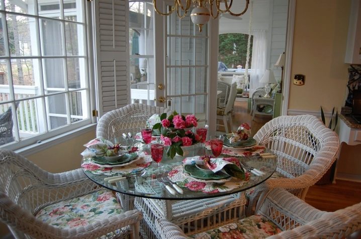 Especially carefully approach the choice of furniture. It should be easy in every sense of the word. You can put, for example, a glass table with an openwork support. In the same style is to pick up and chairs.A good option would be the use of wicker furniture. A woven bamboo coffee table fits perfectly into the interior.