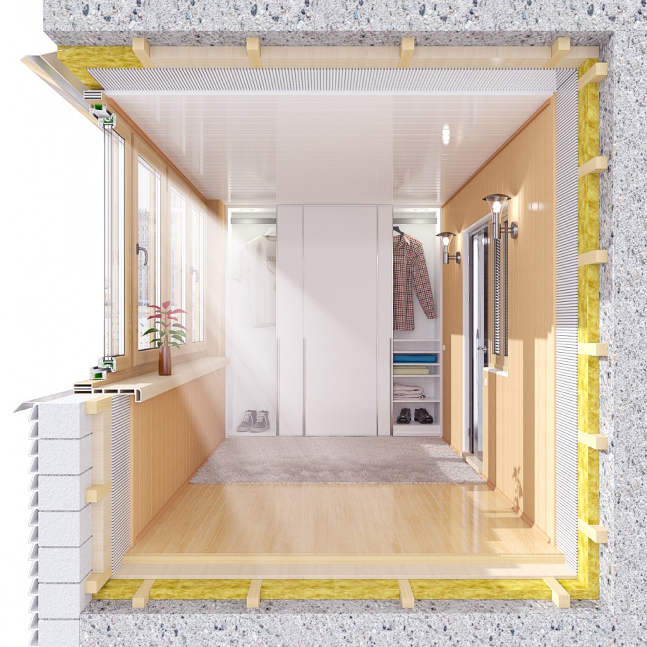 To warm the loggia will help lathing the walls. It is wooden and metal. To save heat, of course, it is better to choose wood.