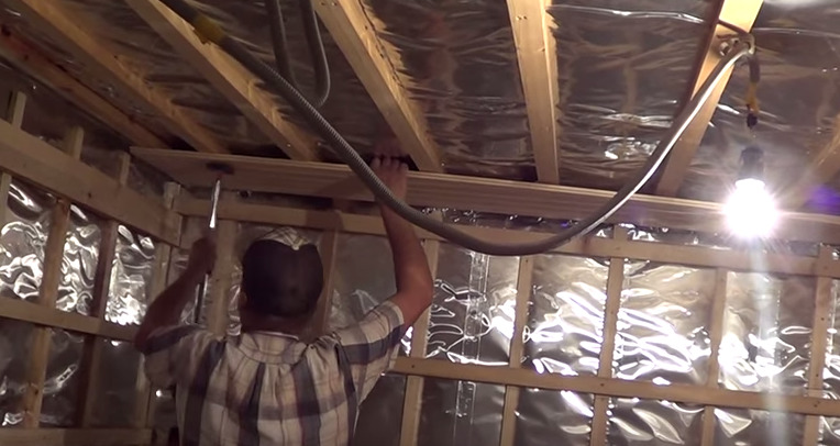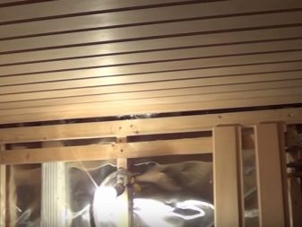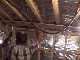 The best material for the ceiling construction is wood. The wooden ceiling can be panel, decking, hemming. Often used the last option, in which the beams are sheathed from the bottom boards. A vapor barrier is laid over them, and a heater is laid on top.