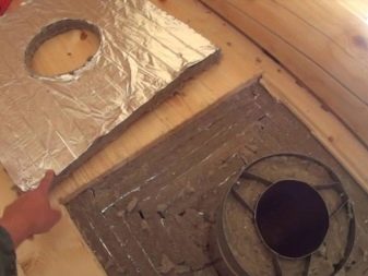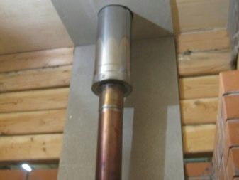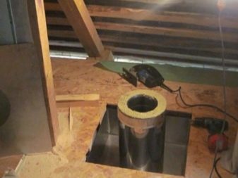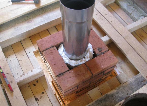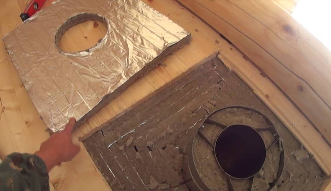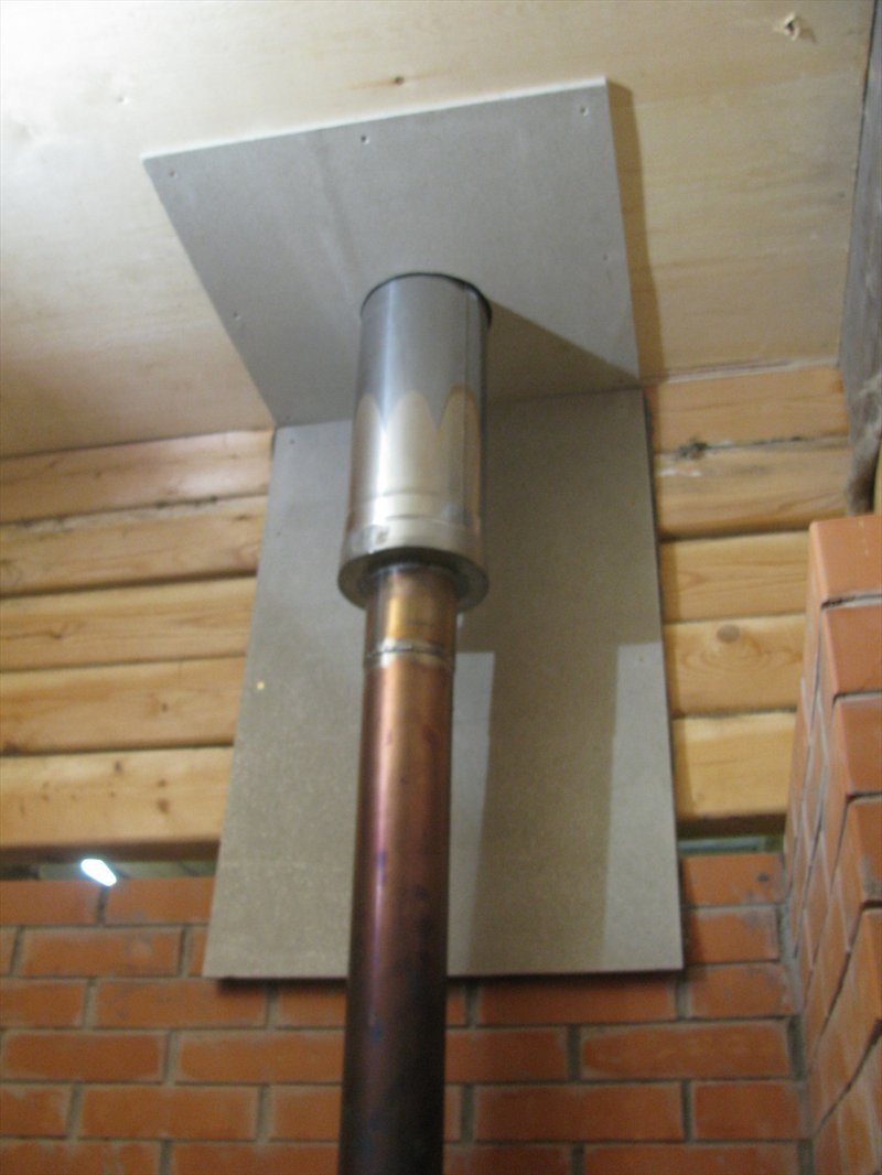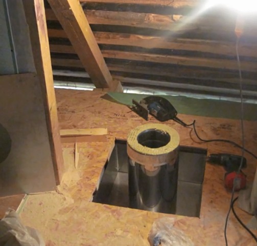 The places of passage of the pipe from the inside and outside are protected by a roof sheet and a roof cut. Heat-resistant insulation is laid around the pipe.
