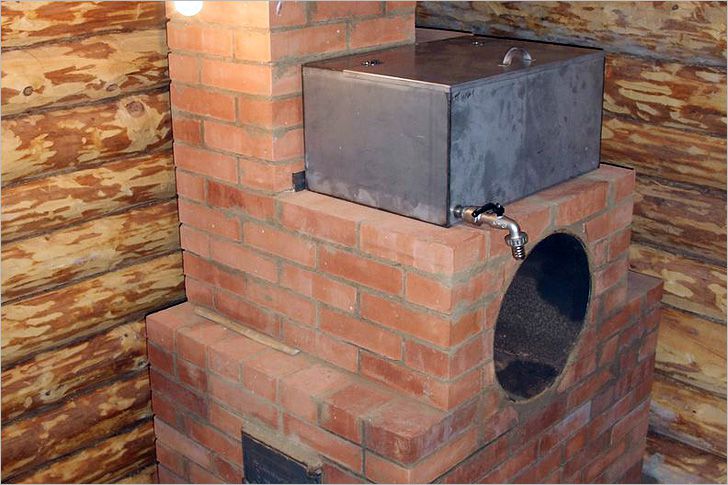 - With stove. This option for the bath can be considered the most successful. The design consists of a tank, which is installed on a plate of cast iron, bath stones. The tank is closed from 3 sides by a brick wall, due to this, the water temperature remains high for a long time.More often, the tank is installed on top of the firebox, and stones are laid over the chimney, but sometimes both the tank and the stones can be placed in a different order.
