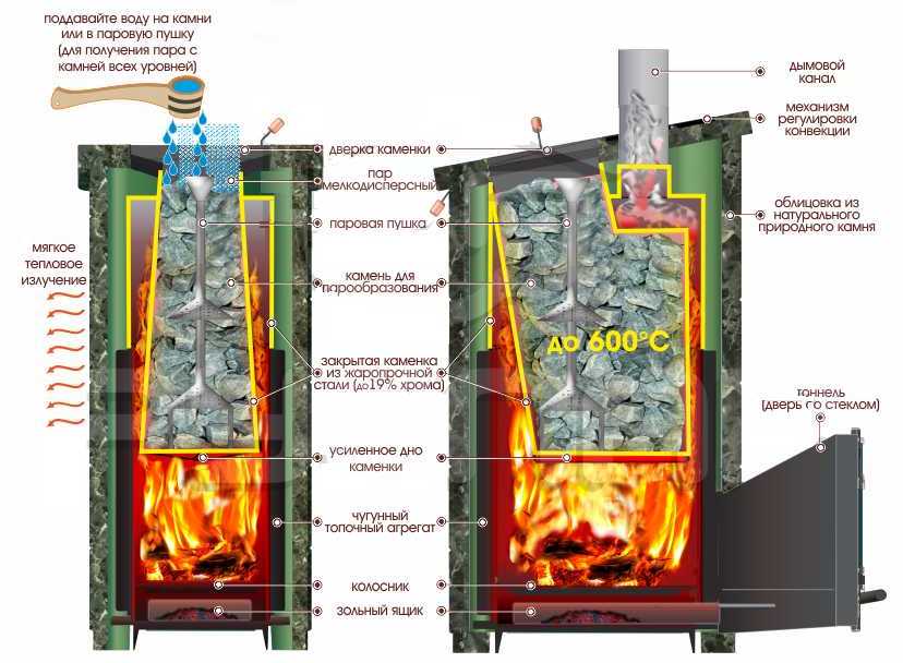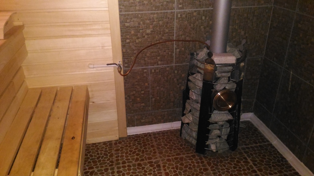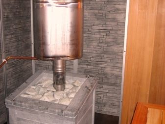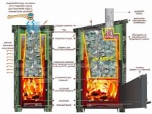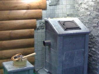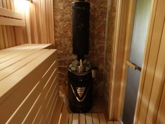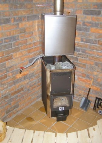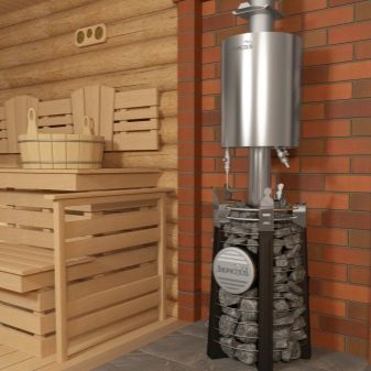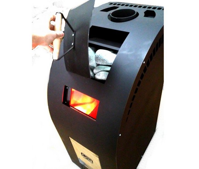 In wood stoves of a similar design, the stones are located in the inner part of the body and are closed with a small lid.The top of the unit is equipped with a special heat-resistant tank for flavoring. The liquid overcomes the capillary system and falls directly on the hot stones.
