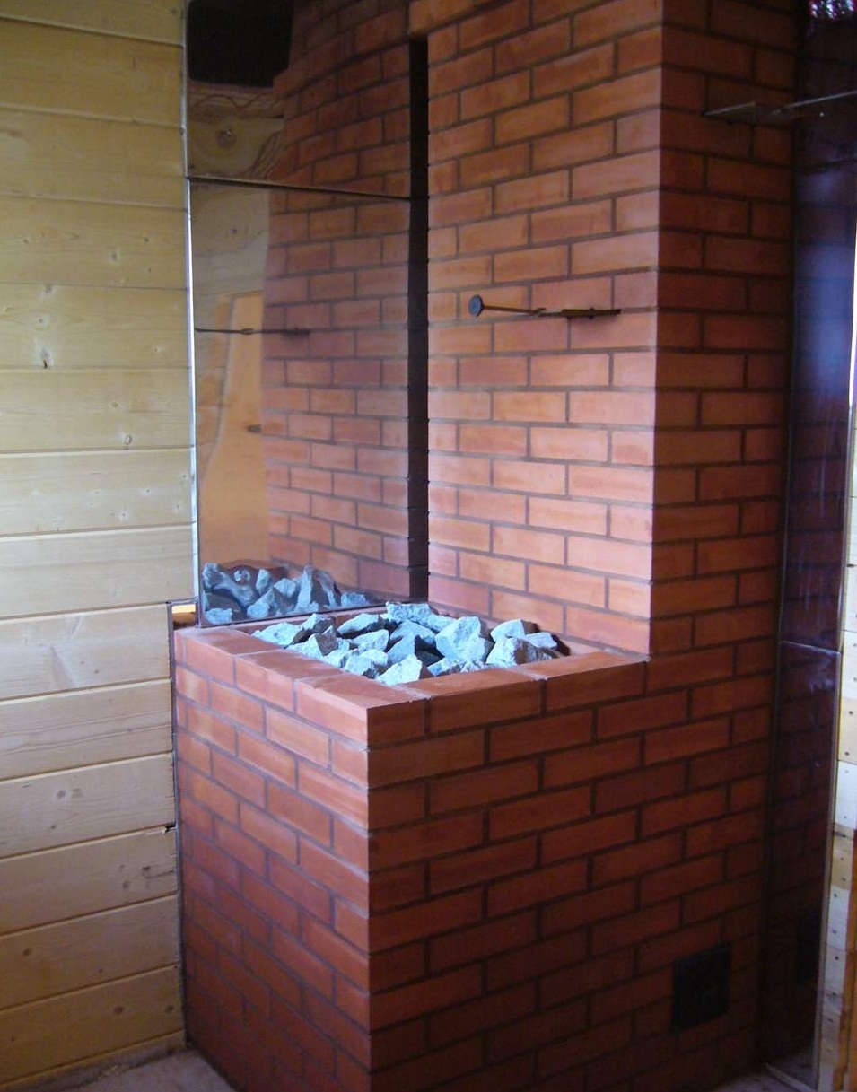 A stove with a firebox without any overhang is a one-piece construction with stones, between which there is an ashpit and a firebox. Similar units are installed directly in the steam room.The flames in the inner part of the body quickly heats the stones to high temperatures. And the already heated stones, in turn, accumulate and transfer heat.