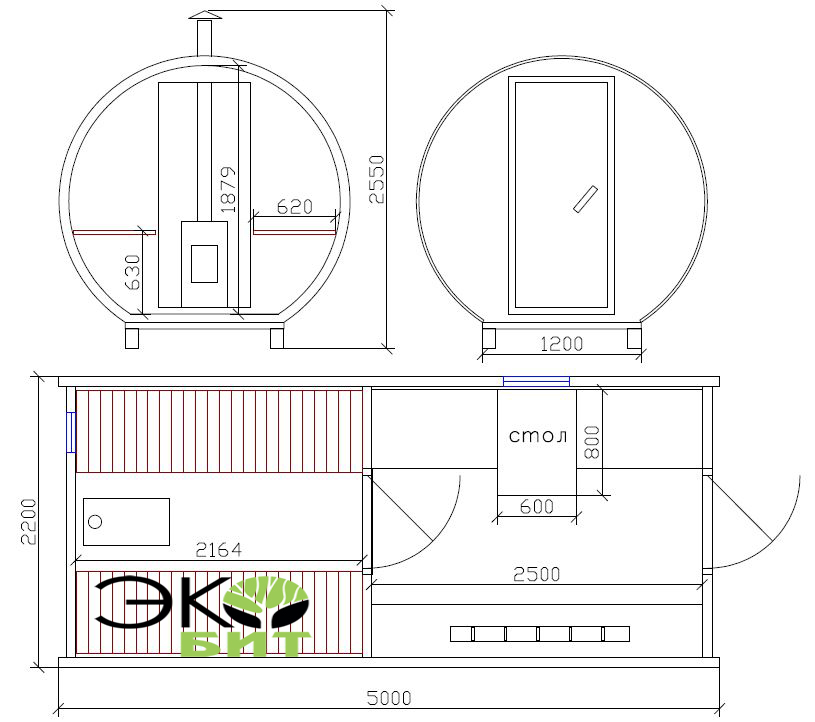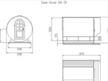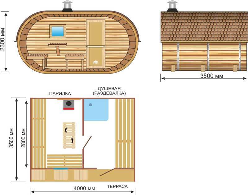 - Russian sauna. The most popular today is the Russian bath-barrel. Since water is used in such bathhouses, high-quality drainage should be provided for in the round design. In order not to face the problem of stagnation of water, it is recommended to install the Russian bath-house under a slight slope. Making the project-drawing of the Russian bath, the stove must be located in the space between the washing compartment and the steam room. Part of the furnace with a tank for heating water at the same time should have access to the sink. In the steam room there will be a container with stones, which are heated by the action of the firebox.