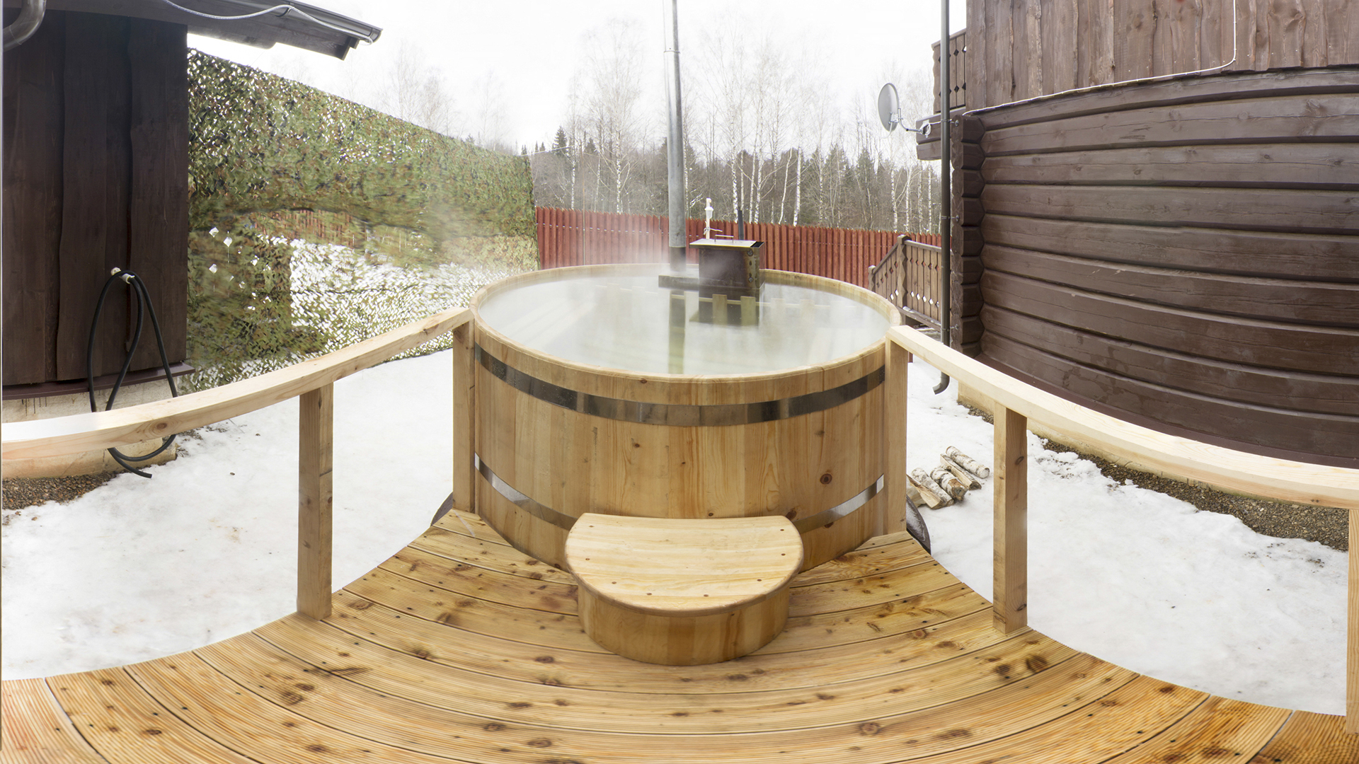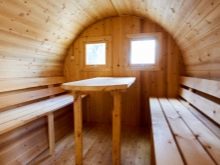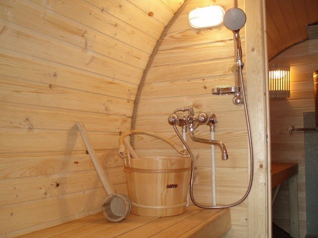 - Finnish. The barrel-shaped bath can be Finnish with dry steam and rather high temperature. Most often, next to the steam room in such constructions there is a font or a wooden container filled with water. And also nearby are often constructed pools.