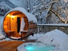 Particularly stylish and attractive look large bath-barrels of dark-colored wood. In the ensemble with metal hoops and the corresponding roof, such constructions resemble enlarged wine barrels. Against the background of dark wood, the entrance doors and window frames of lighter shades look organically.