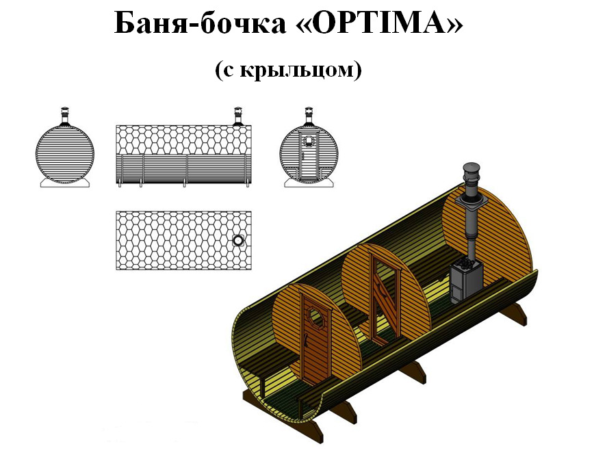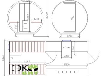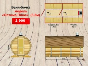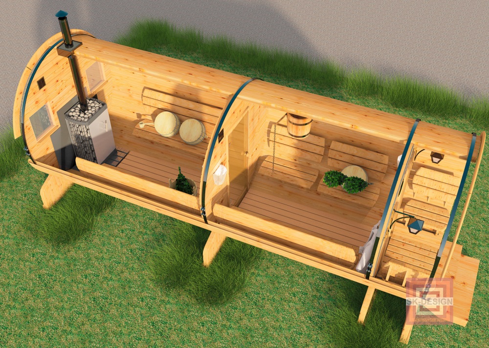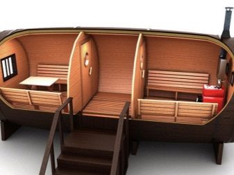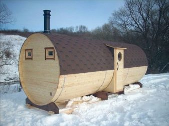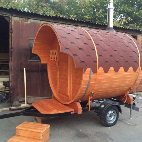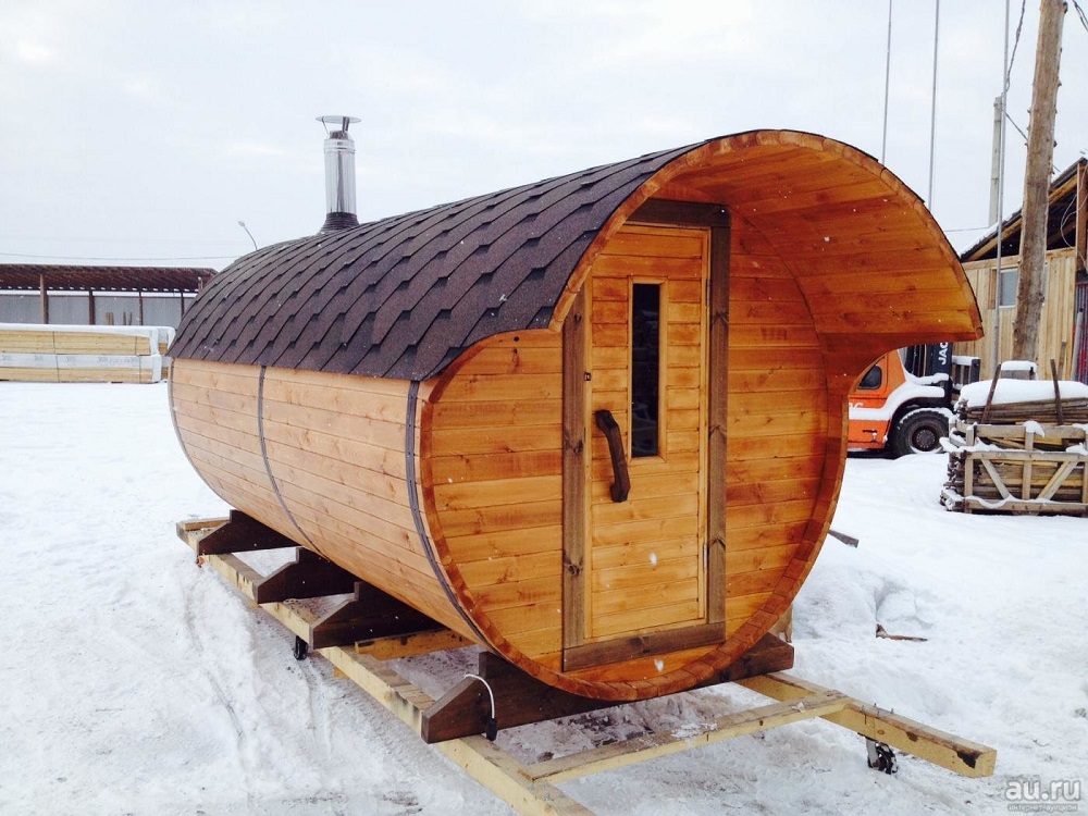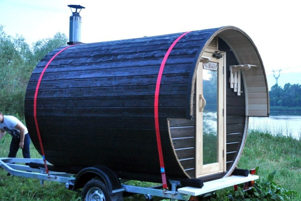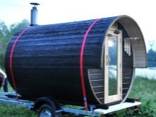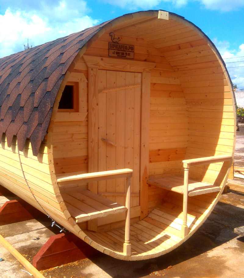 The chimney in such structures is supplied directly under the roof or through the end wall. The design of mobile mobile bath-barrels may differ by the presence of a base on the wheels, and such details may be available both in a structure with an oval-type shape, and in square structures with rounded corners (quad bath). In most cases, the entrance doors are installed from the end, but there are also buildings with an entrance on the side..