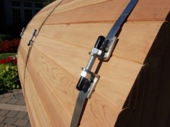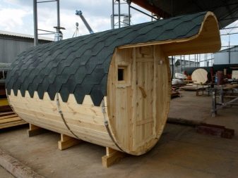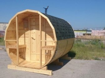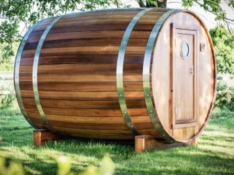 As a rule, baths, made in the form of barrels, have very simple and uncomplicated constructions, represented by end walls assembled from a grooved board. These parts are usually made in the form of circles. Externally, this basis is trimmed with boards.