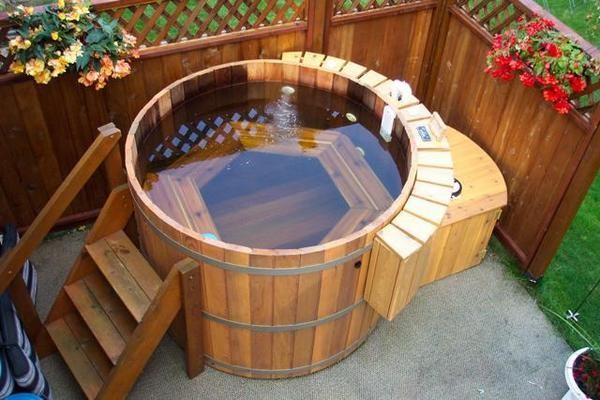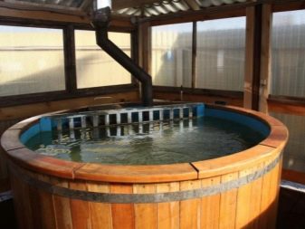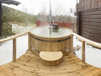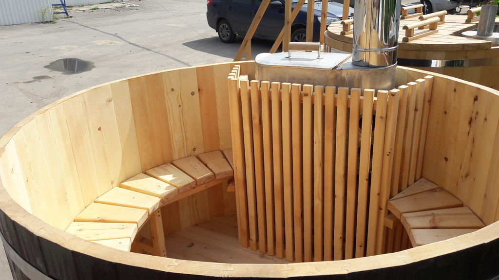 - Ofuro - This is a Japanese version of the bath. It is very easy to operate.In this design there is no roof, and the barrel itself has a slightly elongated shape. It is placed on a wooden flooring. The internal part of the bath ofuro is equipped with all the necessary components - a stove and comfortable benches made of wood. In this case, the stove is located at a safe distance and is complemented by a dense partition that perfectly protects users of the Japanese bath from burns. A feature of the bath ofuro is that it takes a lot of time to warm up well because it is open and has no roof. Because of this, of course, fuel consumption rises.