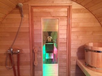 In the inner part of the barrel bath it is permissible to arrange a hot water tank, as well as equip a washing room with a shower, as in a bath of a usual structure. In the role of internal doors that divide the partitions between the individual compartments of a round bath, we often use webs of tempered glass.. Such options let the light through and visually expand the available space, rather than clutter it up.