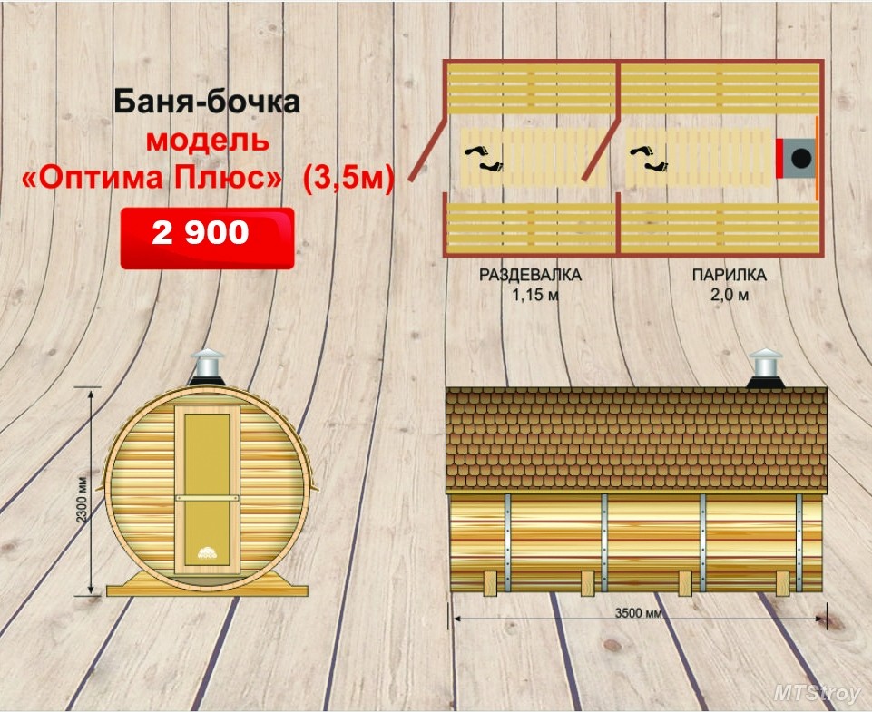 The smallest are baths in 2 m. Such structures consist of only one compartment - the steam room, in which the stove is located. And also there are bath-barrels and ovalbags with dimensional parameters 4x4, 2.4x4 m.