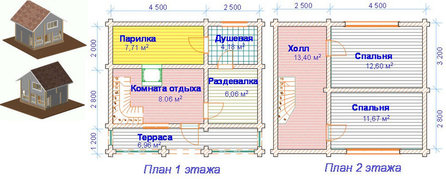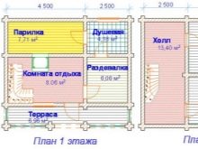 Depending on how many people will visit the bath, you need to determine its size. For a family of 4-5 people, a small two-story building will suffice.