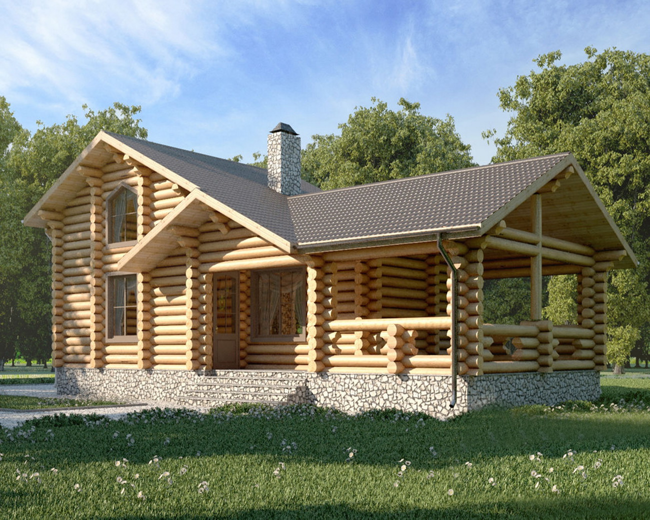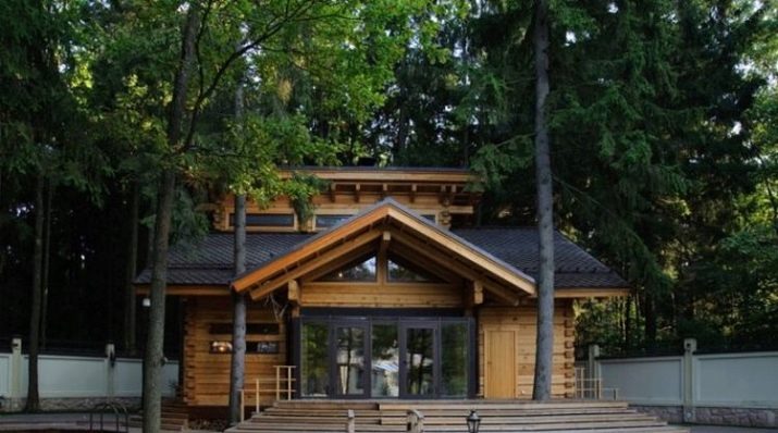 A very beautiful version of a bath with a double-sided roof of logs looks like a real residence.