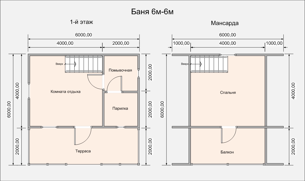 Two-storeyed baths can vary in size from 3 to 4, 4x4, 6x4 m for one person up to 10 x 14 m or more for 8 people. Most home saunas are 6 by 9 m with a ceiling of 7 by 8 m.