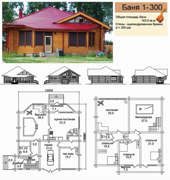 A very beautiful version of a 9x9 m bath with a swimming pool. It can be both open and closed. Closed winter version can be inside the bath itself, on its first floor.Such a bath can be 6x9 m in size and even with its own garage.