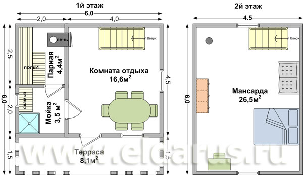 If you do not plan to equip a high-grade second floor with several rooms, you can choose a bath with an attic, the design of which will allow you to double the usable area with minimal costs.