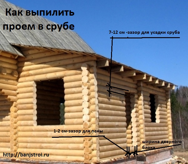 Window and doorways are cut in the already erected and insulated log house. Strengthen them okosyachkoy, and fasten it with window frames and door frames.