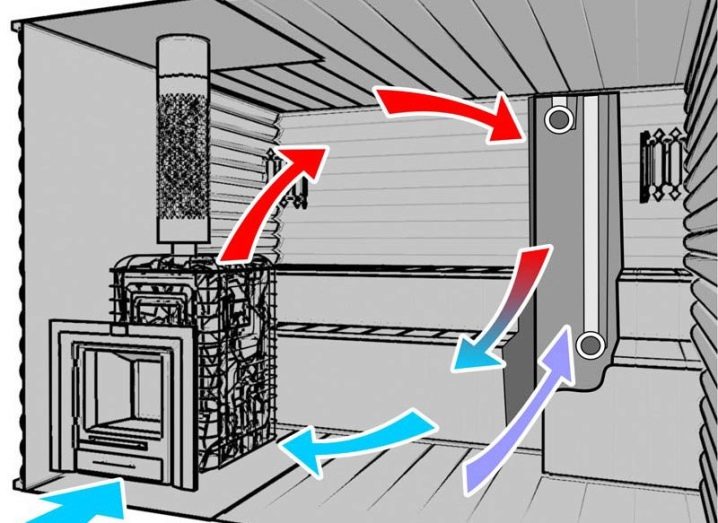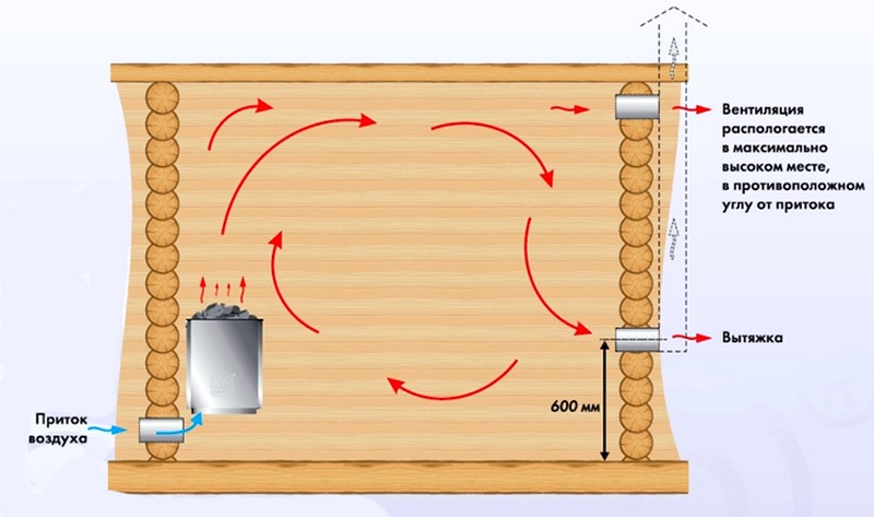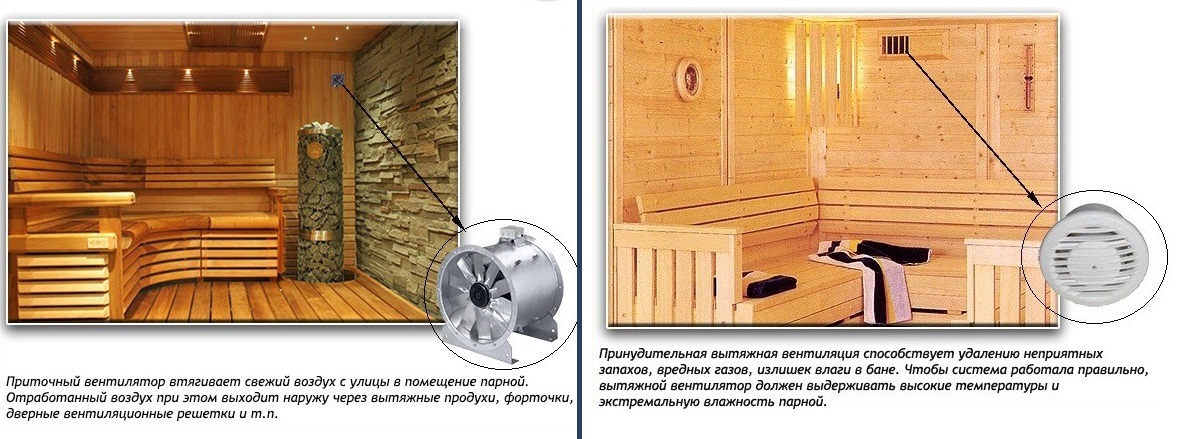 However, it is precisely forced ventilation that is required in most cases, otherwise the bath will simply be dangerous to operate. Indeed, in a hot steam room or sauna, the higher a person sits, he inhales oxygen and exhales carbon dioxide. At temperatures above 60 ° C, if there is no normal circulation, it is easy to get angry.