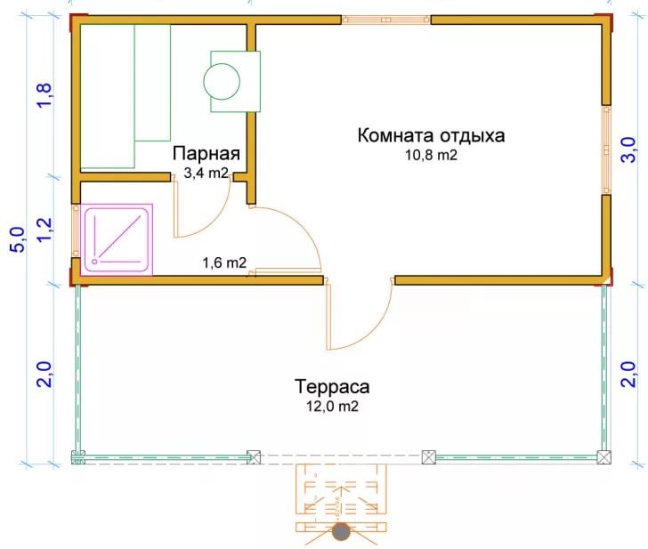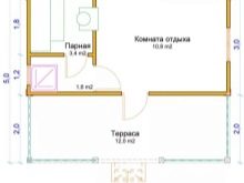 Another option is possible - it is not necessary to include the terrace in the total area of the sauna room. It can be attached to the side (the most popular size of 3x7 meters) and then the size of the premises inside will not have to be reduced.