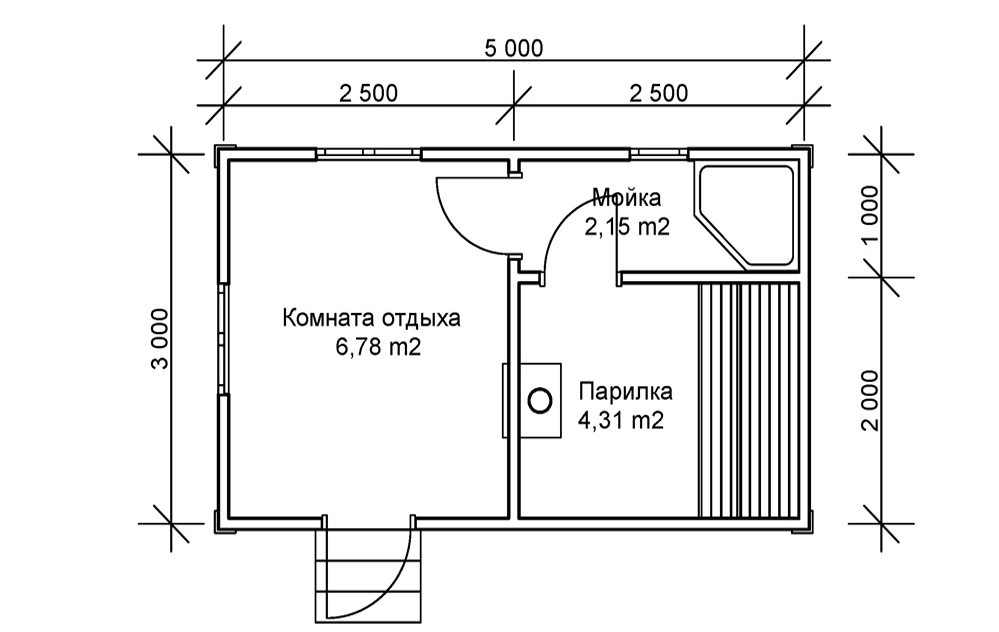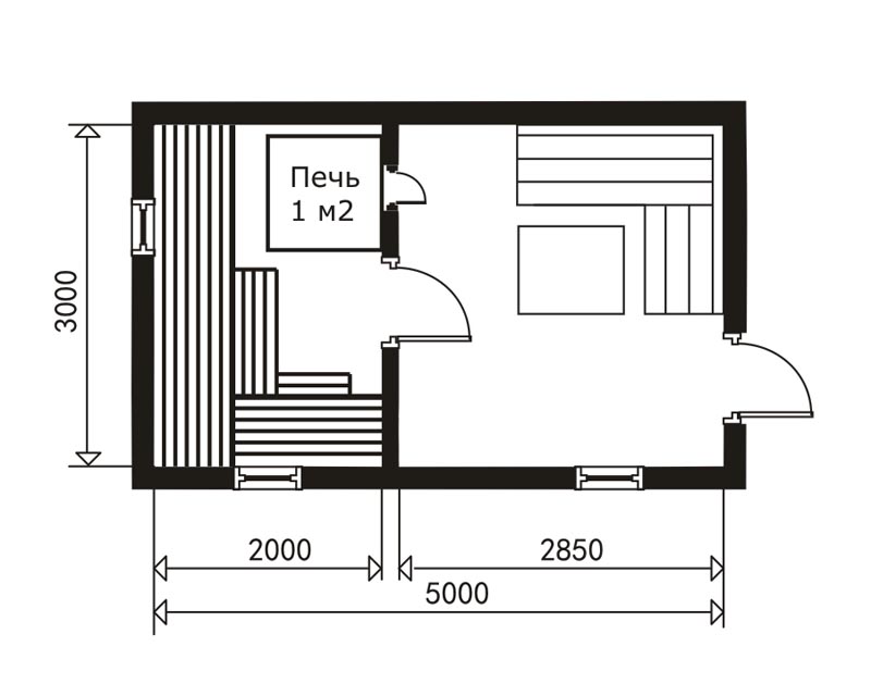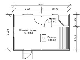 - Before building a building with a sink and a steam room, located separately, the total area is divided into at least 3 parts. The territory of 2x3 meters is allocated for a room where you can relax or change clothes quite comfortably. The remaining meters are divided almost equally, and you get two pretty decent rooms of 3.4x1.5 meters and 3.4x1.4 meters.